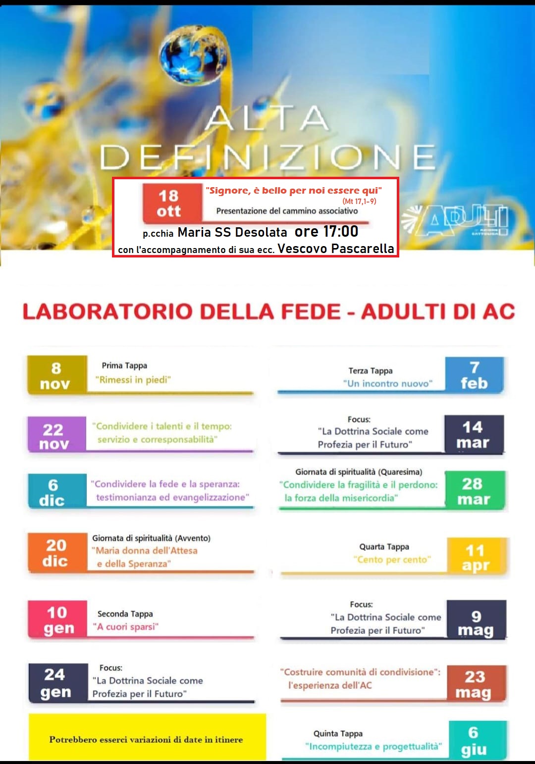Sabato 18 ottobre, alle ore 17, nella parrocchia Maria SS. Desolata a Bagnoli (via Amedeo Maiuri, 8), avvio Laboratorio della Fede organizzato dall’Azione Cattolica Adulti della diocesi di Pozzuoli.