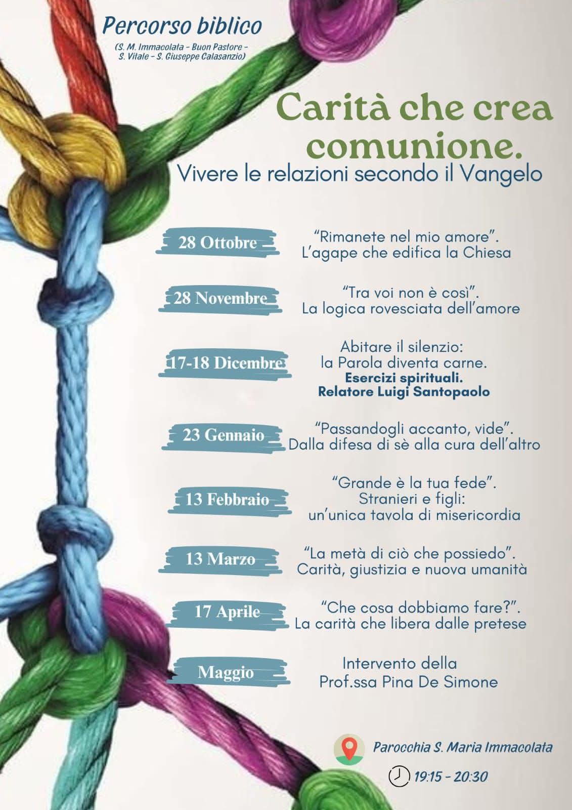 Martedì 28 ottobre, dalle ore 19.15 ore 20.30, nei locali della chiesa Immacolata a Fuorigrotta (via Giacomo Leopardi, 128/A), primo appuntamento del Percorso biblico interparrocchiale, organizzato da Immacolata, Buon Pastore, San Vitale e San Giuseppe Calasanzio, dal titolo “Carità che crea comunione. Vivere le relazioni secondo il Vangelo”.