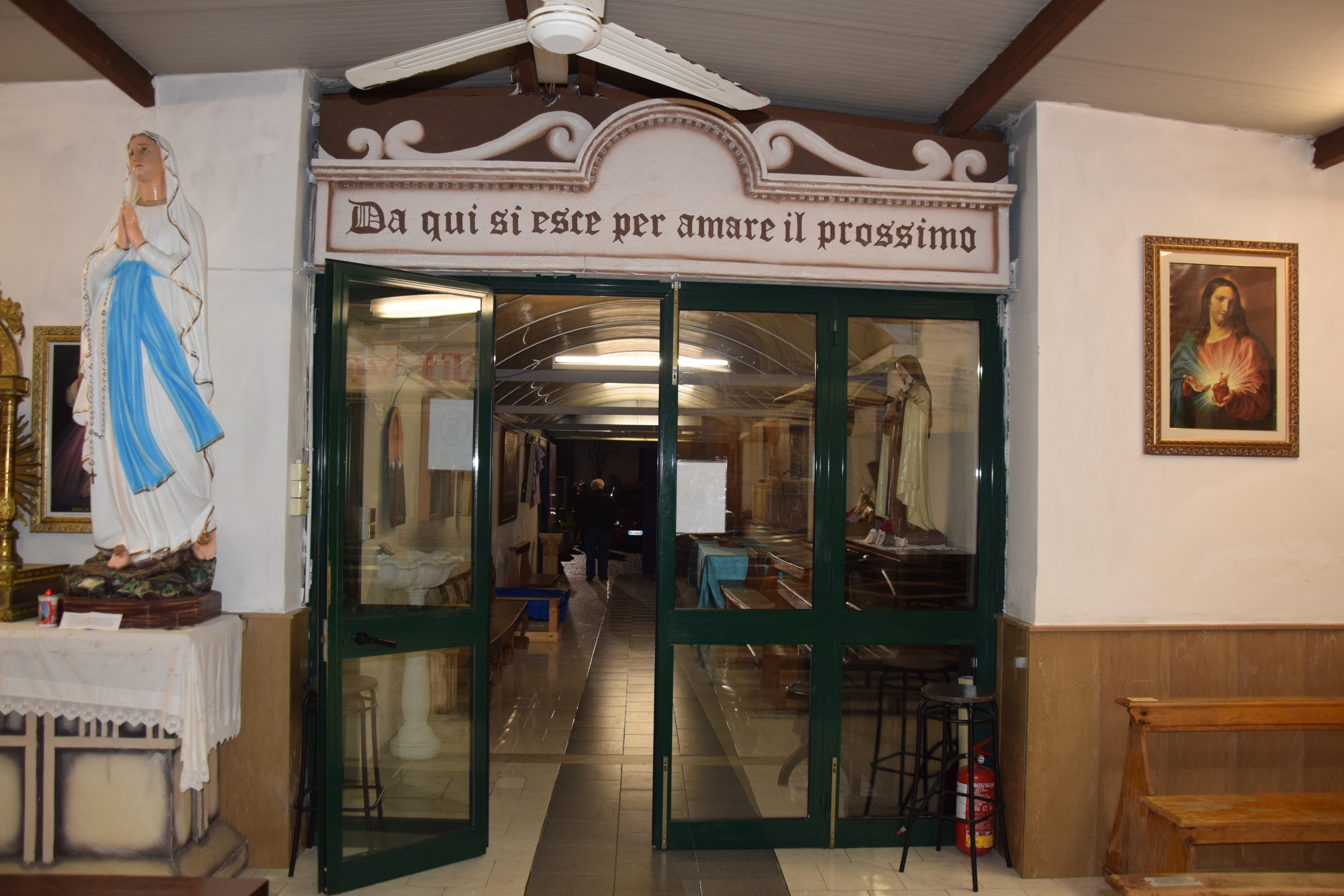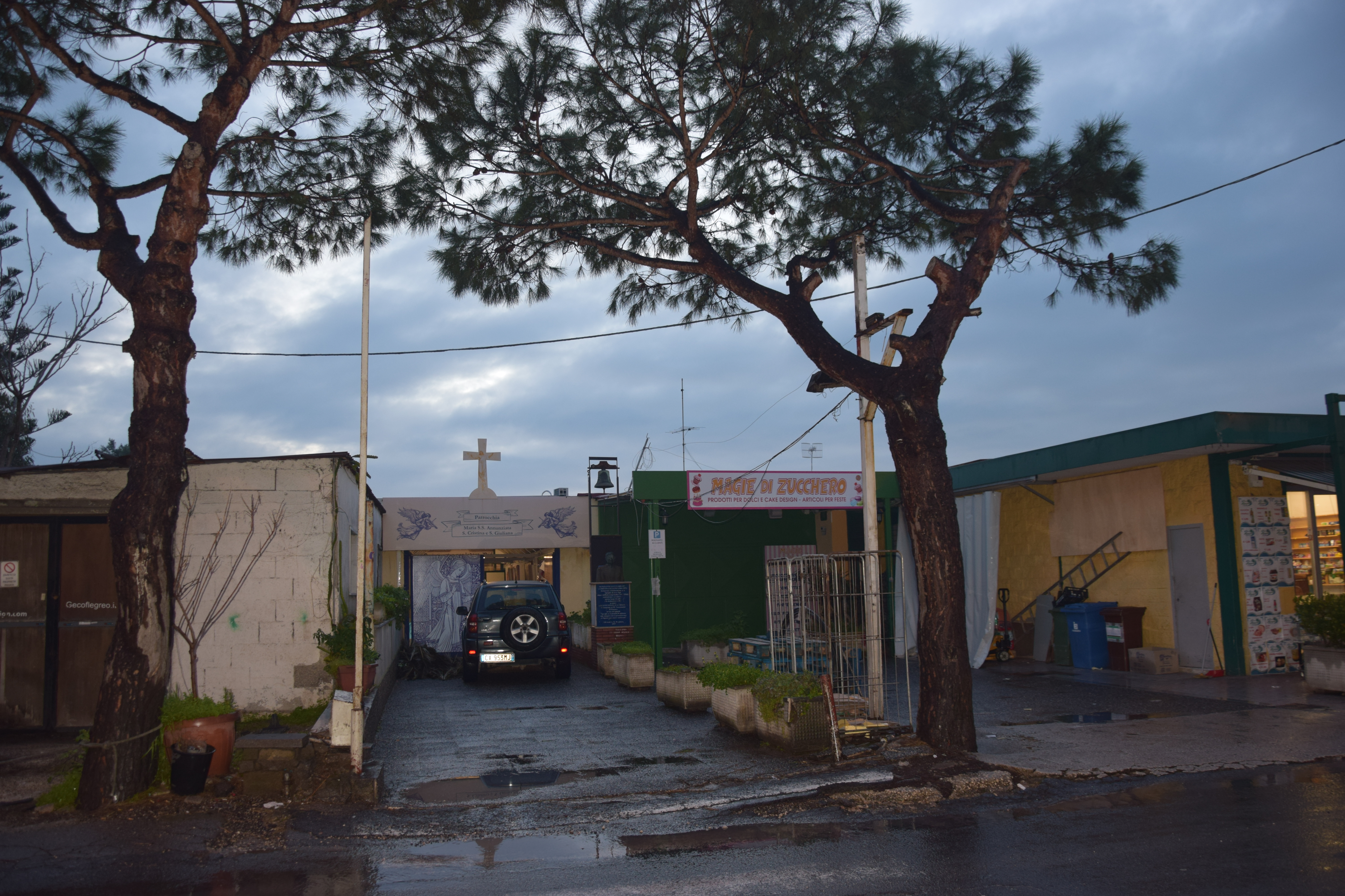 Via Fusaro, frazione di Bacoli. Lungo la strada che porta alla Casina Vanvitelliana, edificio che costituisce una delle più raffinate produzioni settecentesche, troviamo diverse attività commerciali. Al civico numero 11, nascosta dietro una salumeria e un negozio di articoli per feste, si trova la chiesa “Maria SS. Annunziata, S. Cristina e S. Giuliana”. Eppure, quell’edificio di culto, costituito da una sorta di capannone molto poco rifinito, rappresenta un punto di riferimento per un territorio decentrato rispetto al centro storico bacolese. Non ci sono locali dove svolgere le normali attività catechistiche, ma nelle ore che abbiamo trascorso con il parroco, c’è stato un via vai di persone che passavano nella chiesa per salutarlo, per chiedere indicazioni o una parola di conforto. Una “casa” aperta, posizionata sulla strada. Alcuni cittadini, volontariamente, sono venuti ad aggiustare un finestrone della chiesa che affaccia sul lago Fusaro, distrutto probabilmente dal forte vento.