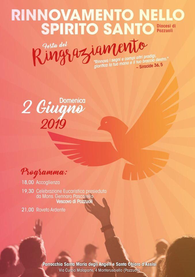 Domenica 2 giugno, dalle ore 18, nella parrocchia Santa Maria degli Angeli e Santa Chiara di Assisi a Monterusciello – Pozzuoli, Festa del Ringraziamento del Rinnovamento nello Spirito Santo. Dopo la celebrazione eucaristica presieduta dal vescovo, monsignor Gennaro pascarella (alle ore 19.30), si terrà un momento di adorazione eucaristica “Roveto ardente” (alle ore 21).