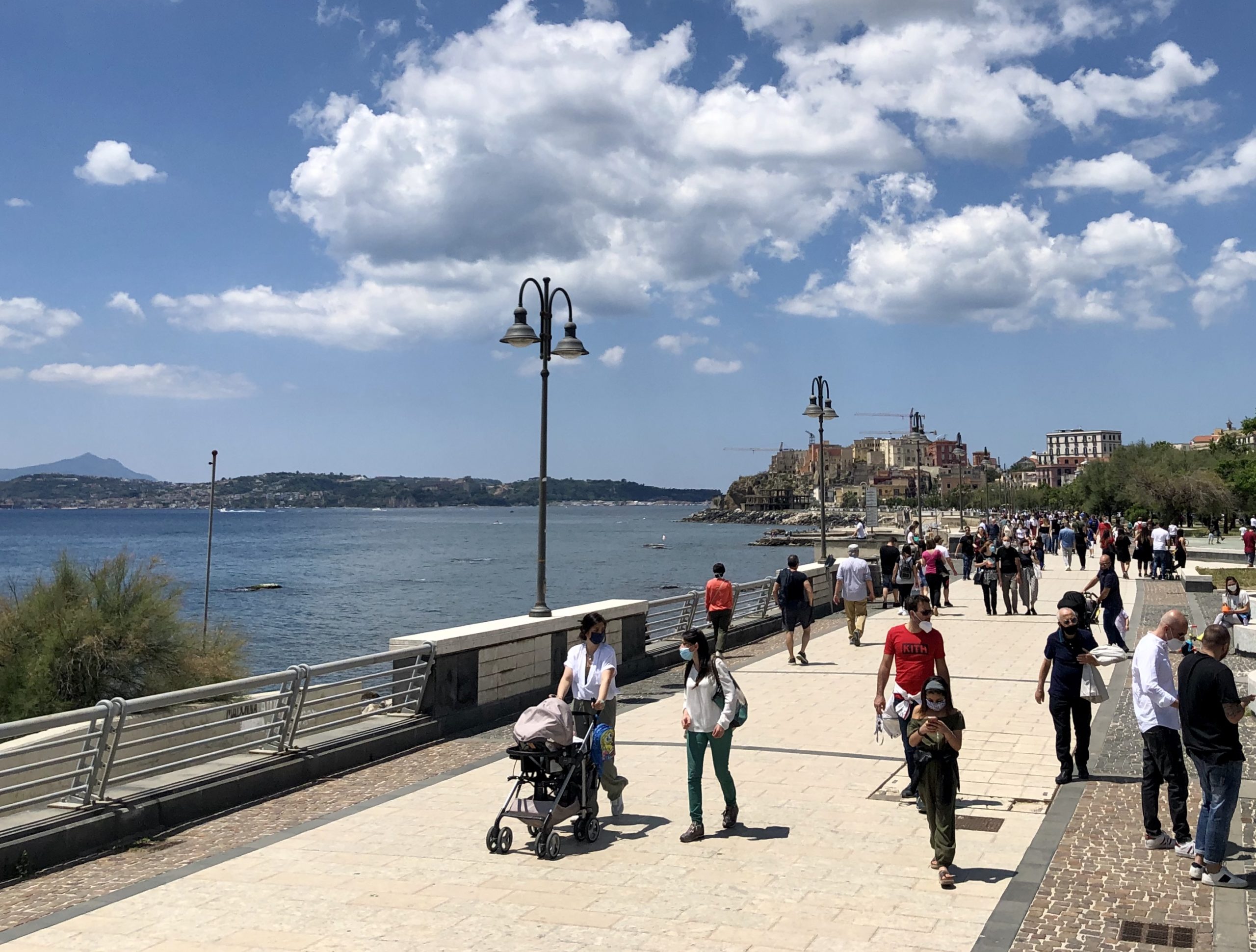 Via Napoli di Pozzuoli in mascherina. I puteolani hanno accolto la bella giornata di sole e festeggiato la ricorrenza del 2 giugno, passeggiando sul lungomare Pertini.