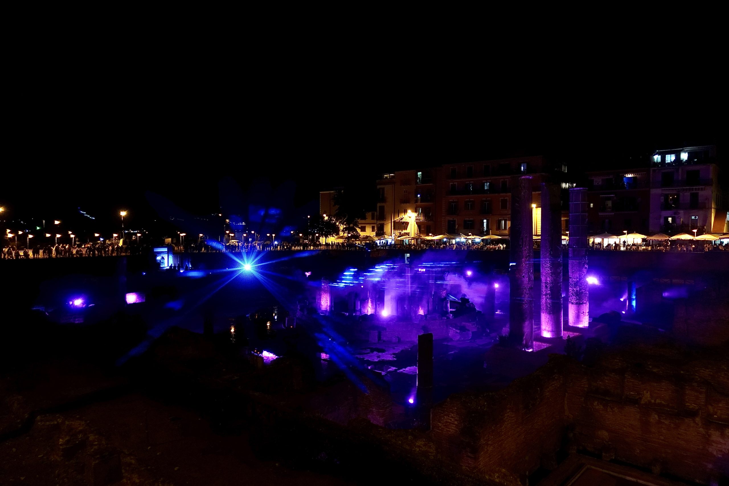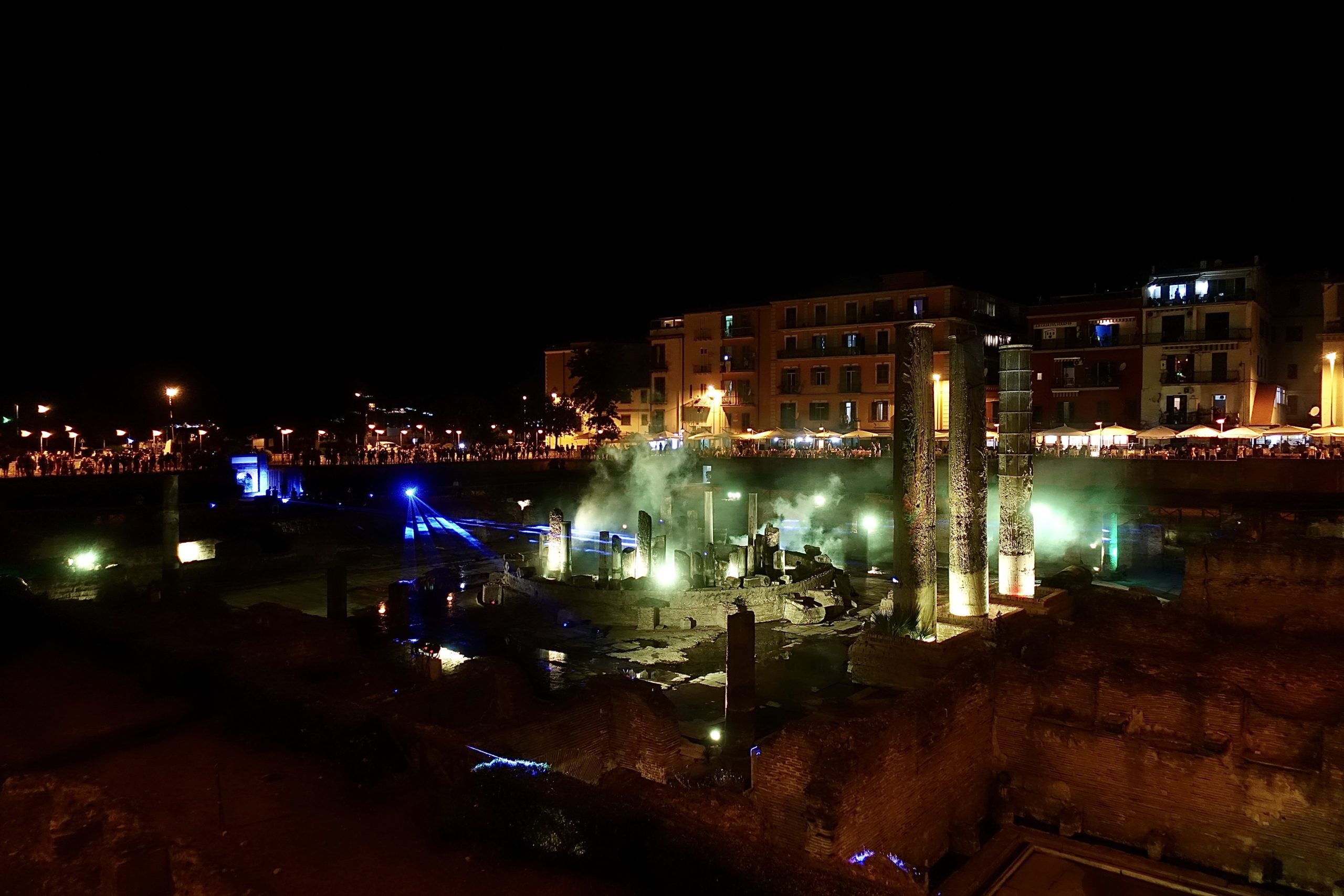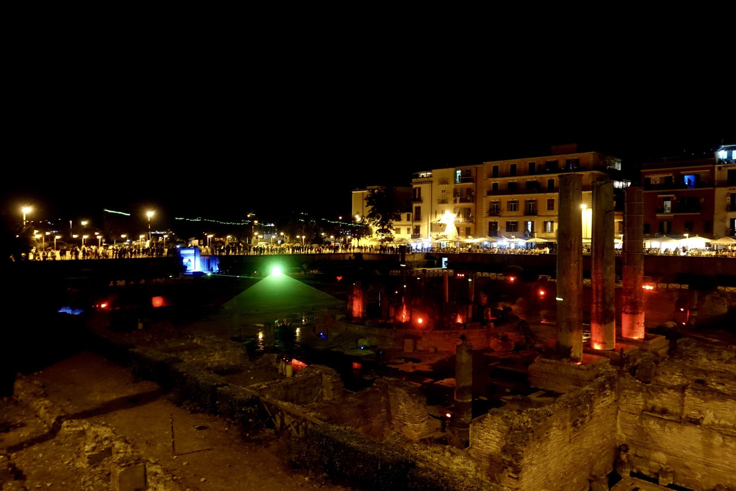 Il Tempio di Serapide/Macellum di Pozzuoli è stato di nuovo illuminato, grazie allo spettacolo serale, dal titolo Overture, verso il Mediterraneo e oltre, organizzato dall’ATI Macellum. La coreografia, realizzata venerdì 7 agosto, dall’imbrunire alla mezzanotte, è stata composta da luci, laser, proiezioni e musica.