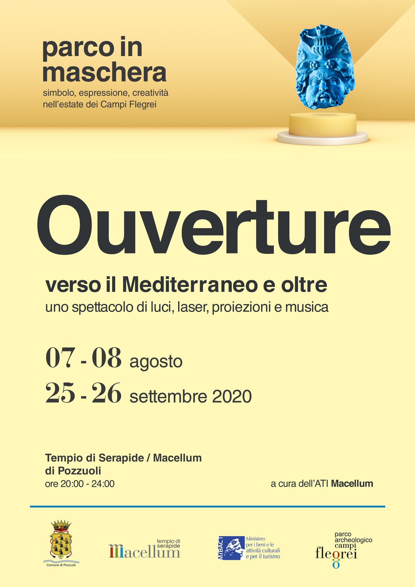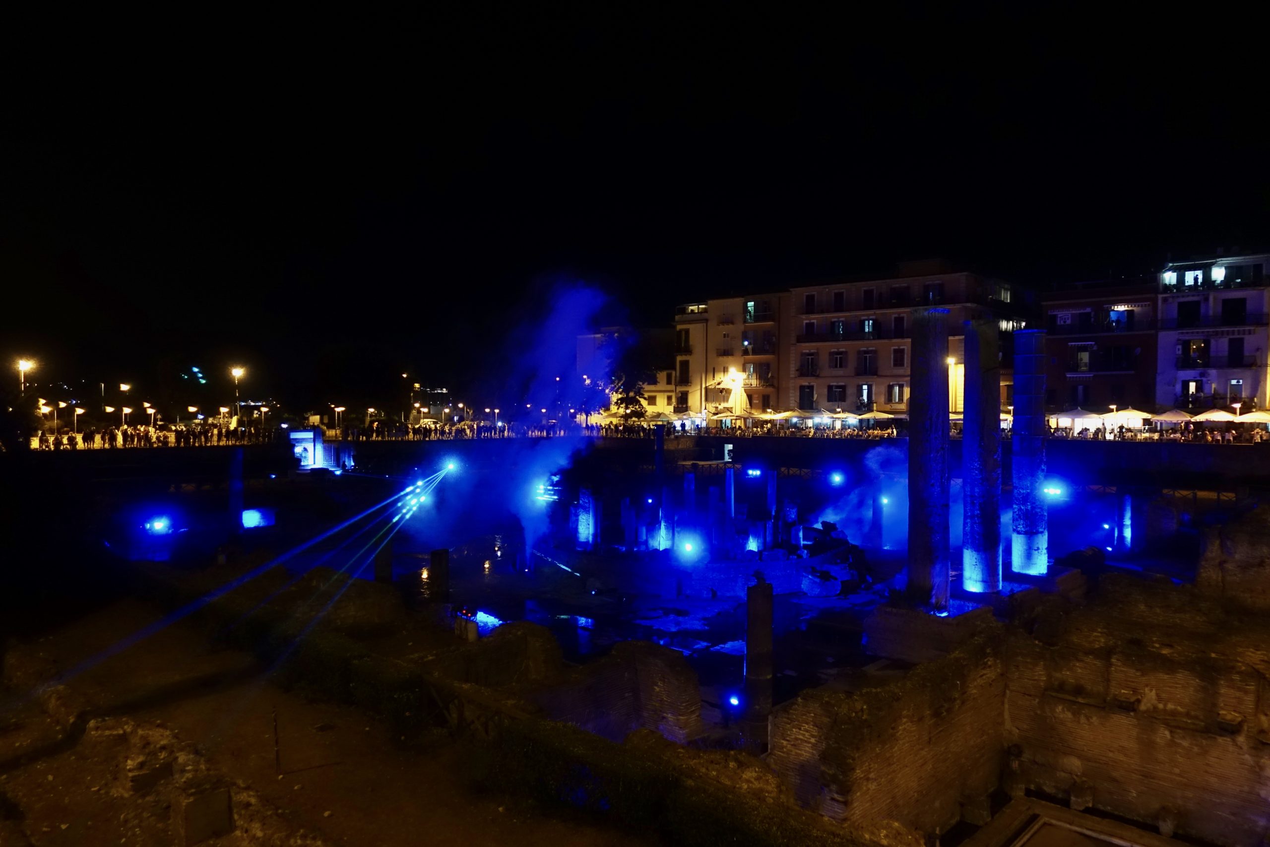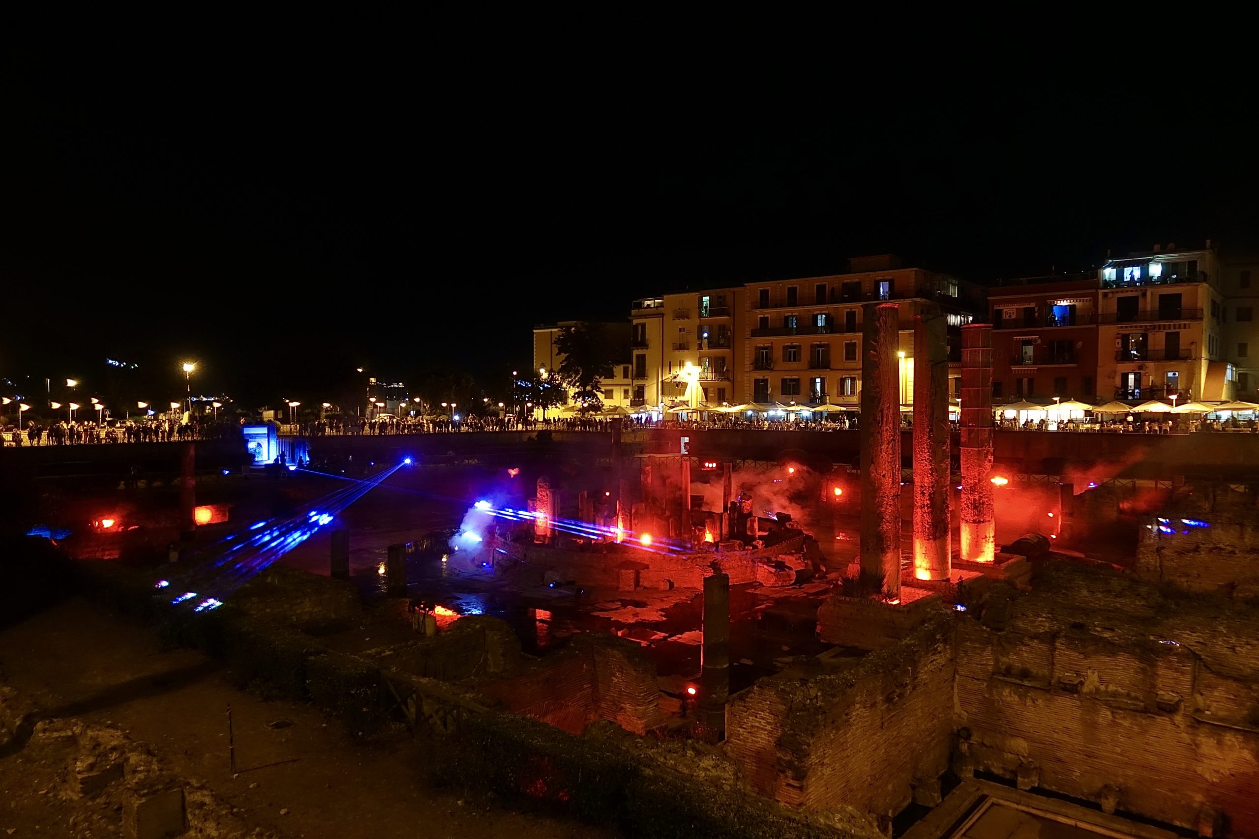 Il Tempio di Serapide/Macellum di Pozzuoli è stato di nuovo illuminato, grazie allo spettacolo serale, dal titolo Overture, verso il Mediterraneo e oltre, organizzato dall’ATI Macellum. La coreografia, realizzata venerdì 7 agosto, dall’imbrunire alla mezzanotte, è stata composta da luci, laser, proiezioni e musica.