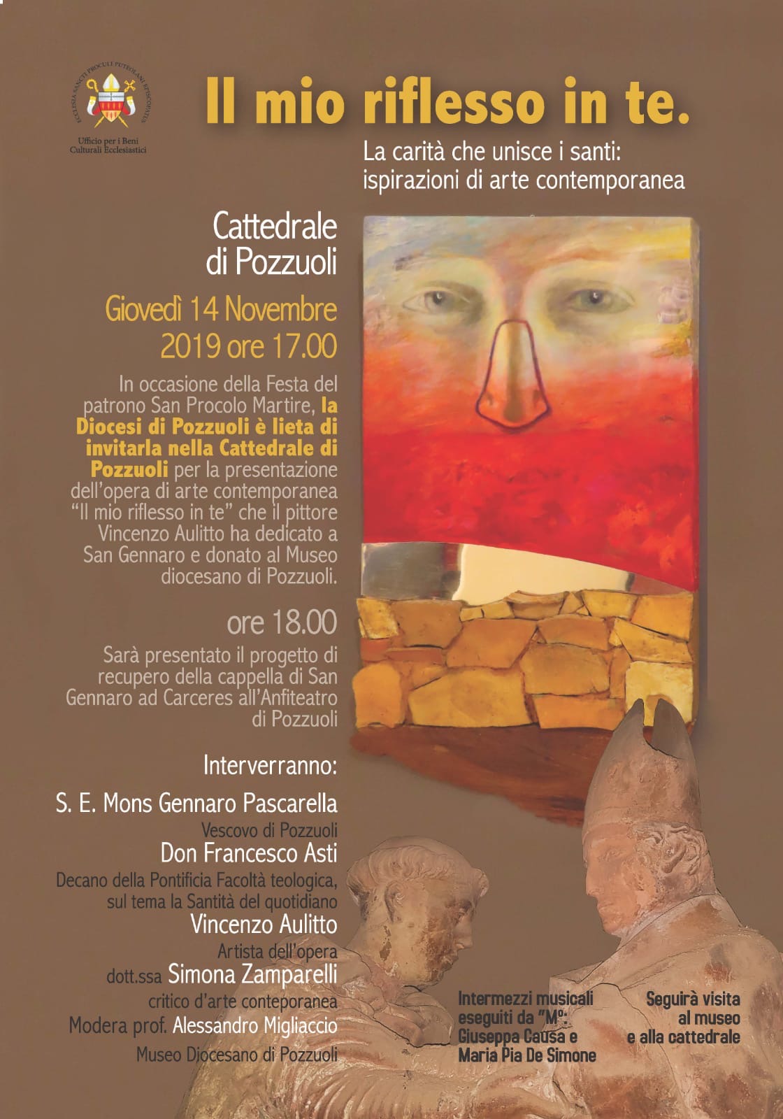 Giovedì 14 novembre, alle ore 17, in occasione della Festa del patrono San Procolo Martire, la diocesi di Pozzuoli è lieta di invitare tutta la cittadinanza, nella Cattedrale sul Rione Terra, per la presentazione dell’opera di arte contemporanea “Il mio riflesso in te”, che il pittore Vincenzo Aulitto ha dedicato a San Gennaro e ha donato al Museo diocesano puteolano. Nell’occasione verrà presentato il progetto di recupero della Cappella di San Gennaro ad Carceres situata nell’Anfiteatro di Pozzuoli.
