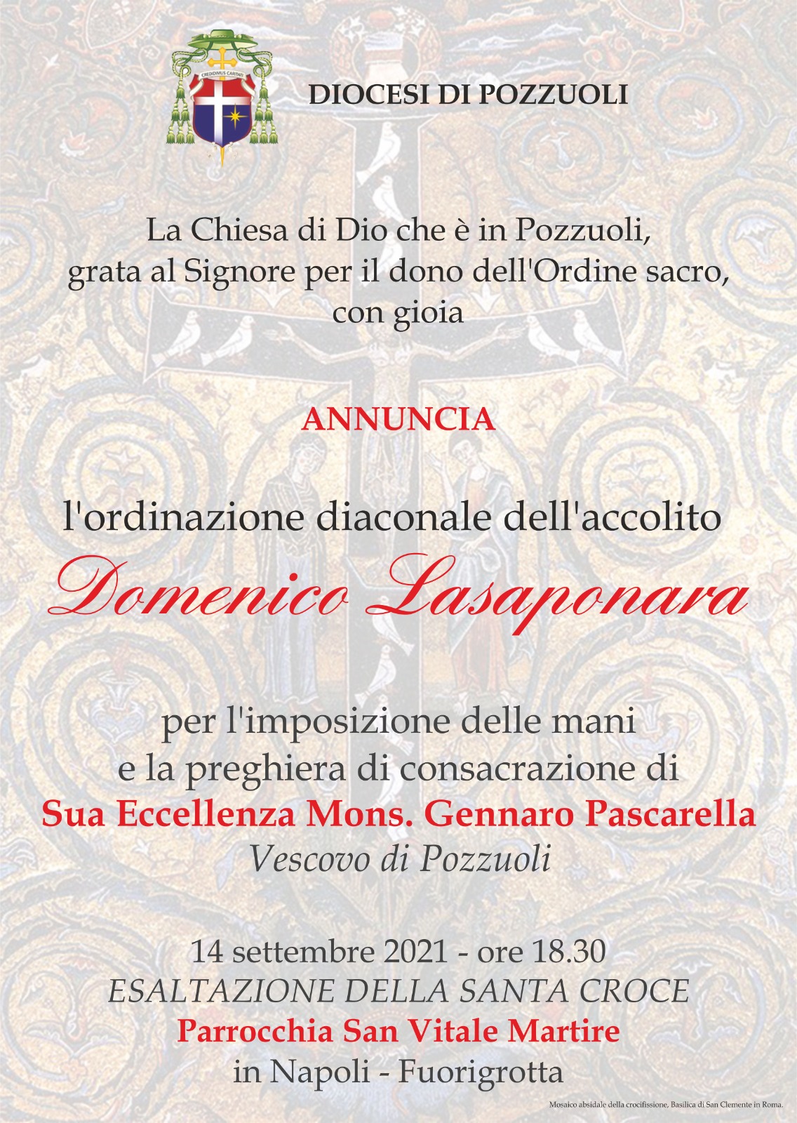 Martedì 14 settembre, giorno della Esaltazione della Croce, nella parrocchia San Vitale martire a Napoli (piazza San Vitale – Fuorigrotta), il vescovo di Pozzuoli e di Ischia, monsignor Gennaro Pascarella, ordina diacono l’accolito Domenico Lasaponara. La celebrazione inizia alle ore 18.30.
