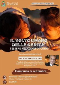 Domenica 21 settembre, alle ore 19, nel santuario Maria Regina della Pace a Quarto (via Plinio il Vecchio, 14), si svolgerà l’incontro di apertura del nuovo anno pastorale della diocesi di Pozzuoli, sul tema “Il volto umano della carità. Tessere relazioni di cura”.