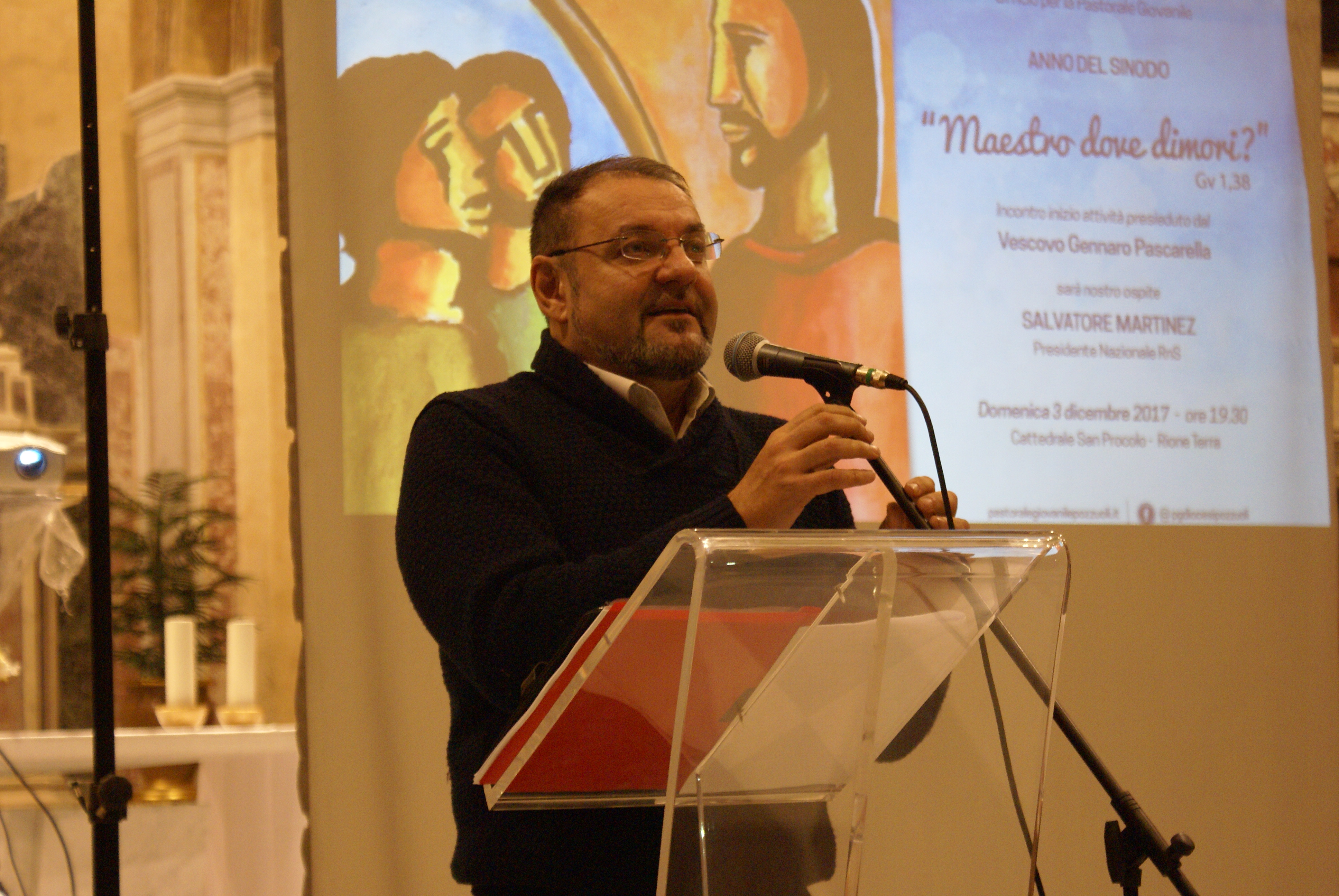 È fondamentale però far sentire la nostra sensibilità, la nostra curiosità e perfino i nostri dubbi e le nostre critiche, affinché la Chiesa ascolti la nostra voce e ci accompagni in questo cammino che il più delle volte sembra un girovagare senza meta. Quindi, non bisogna aver paura di ascoltare lo Spirito che ci suggerisce scelte audaci, o temere la coscienza quando ci chiede di rischiare per seguire il Signore. Anzi, bisogna andare avanti con l’entusiasmo e con quello spirito di avventura che caratterizza la gioventù, nelle circostanze buone ma soprattutto in quelle cattive, quando, guardandoci intorno, sembra che Dio non appaia all’orizzonte. Ospite e testimone dell’evento presieduto dal vescovo monsignor Gennaro Pascarella, è stato Mario Landi, coordinatore nazionale del Rinnovamento nello Spirito Santo. «È proprio in questi momenti – ha esordito Landi – che dobbiamo provocarlo con la domanda “Maestro, dove dimori?” Dio dove sei? E soprattutto se ci sei, batti un colpo nella nostra vita. E vedremo che Lui, al nostro richiamo sincero, autentico, non ci deluderà. Ci risponderà, facendoci capire che non ci ha mai abbandonato, che è proprio lì, accanto a noi e ci guida, orientandoci con la sua grazia, verso i grandi sogni, verso l’amore e la bontà verso i nostri fratelli».