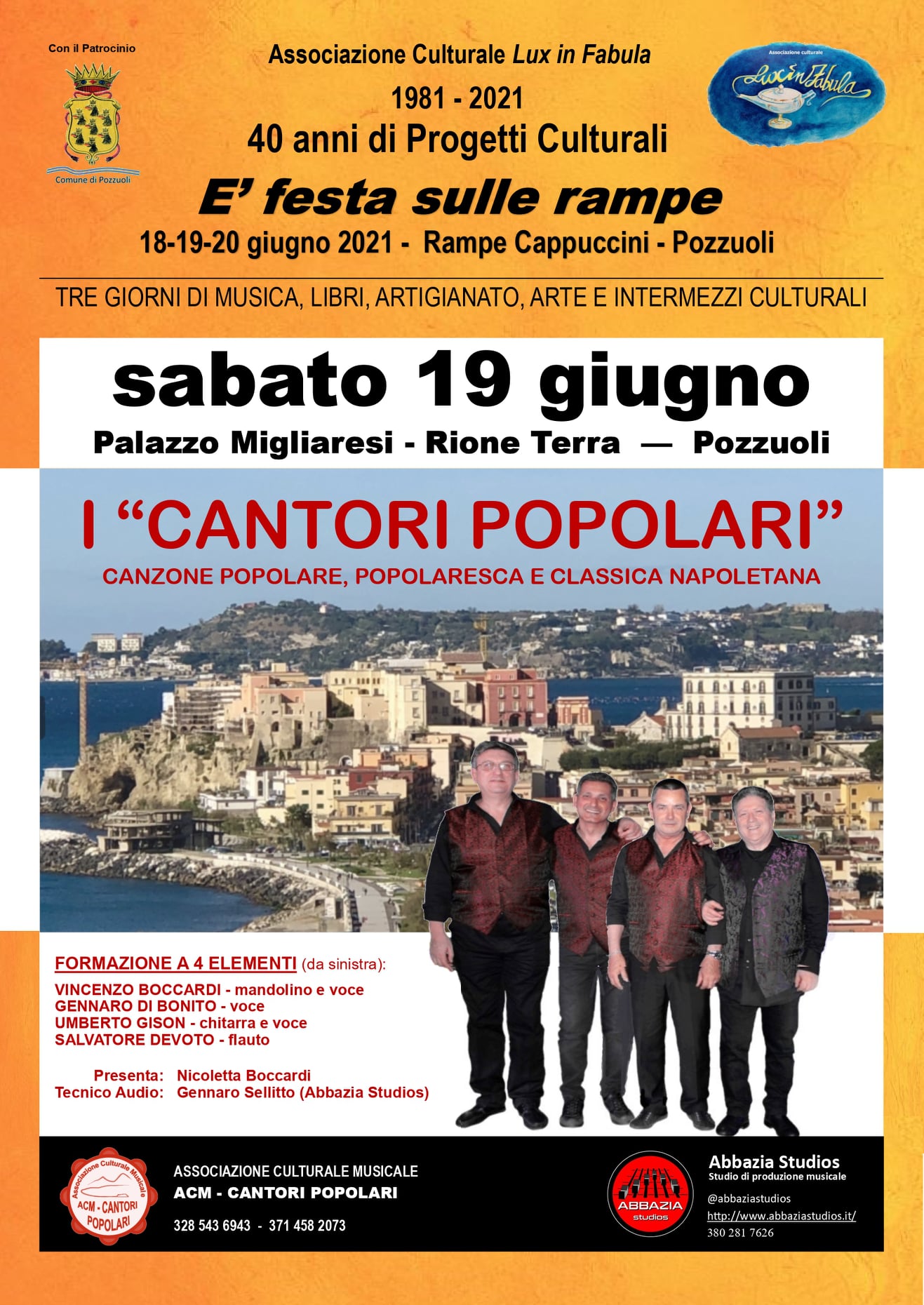 Tre giorni di festa sulle Rampe Cappuccini di Pozzuoli per festeggiare i 40 anni dell’associazione Lux in Fabula. Da venerdì 18 a domenica 20 giugno, dalle ore 9 alle 23, prevista animazione, musica, teatro, spettacoli, artigianato, arte.