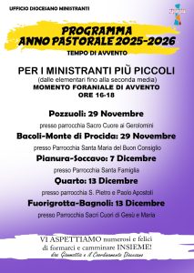 Sabato 29 novembre, dalle ore 16 alle 18, momenti foraniali per i Ministranti più piccoli (dalle elementari fino alla seconda media) organizzati nella parrocchia Sacro Cuore di Gesù ai Gerolomini (per la forania di Pozzuoli ) e nella parrocchia Santa Maria del Buon Consiglio (per la forania di Bacoli Monte di Procida).