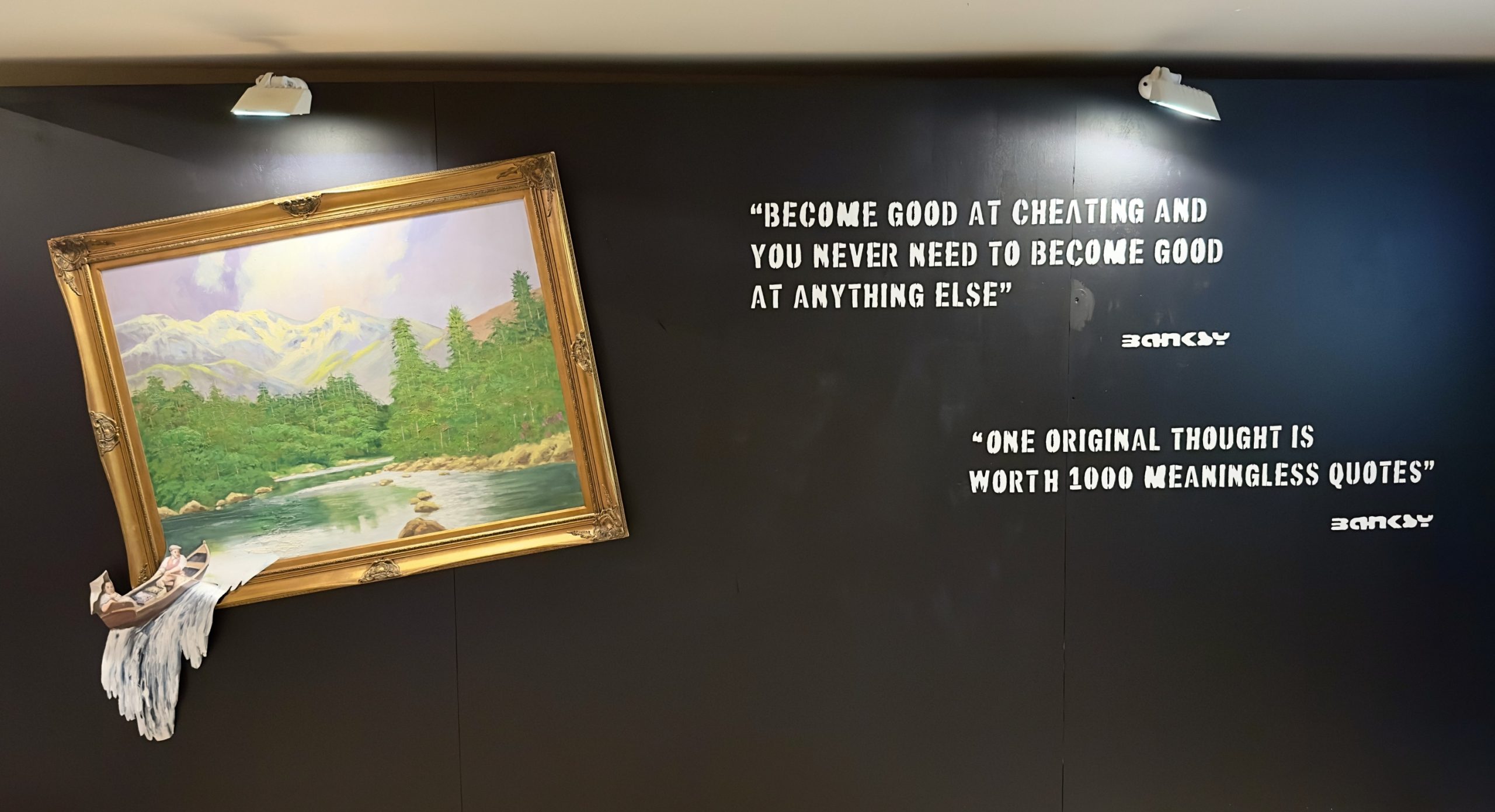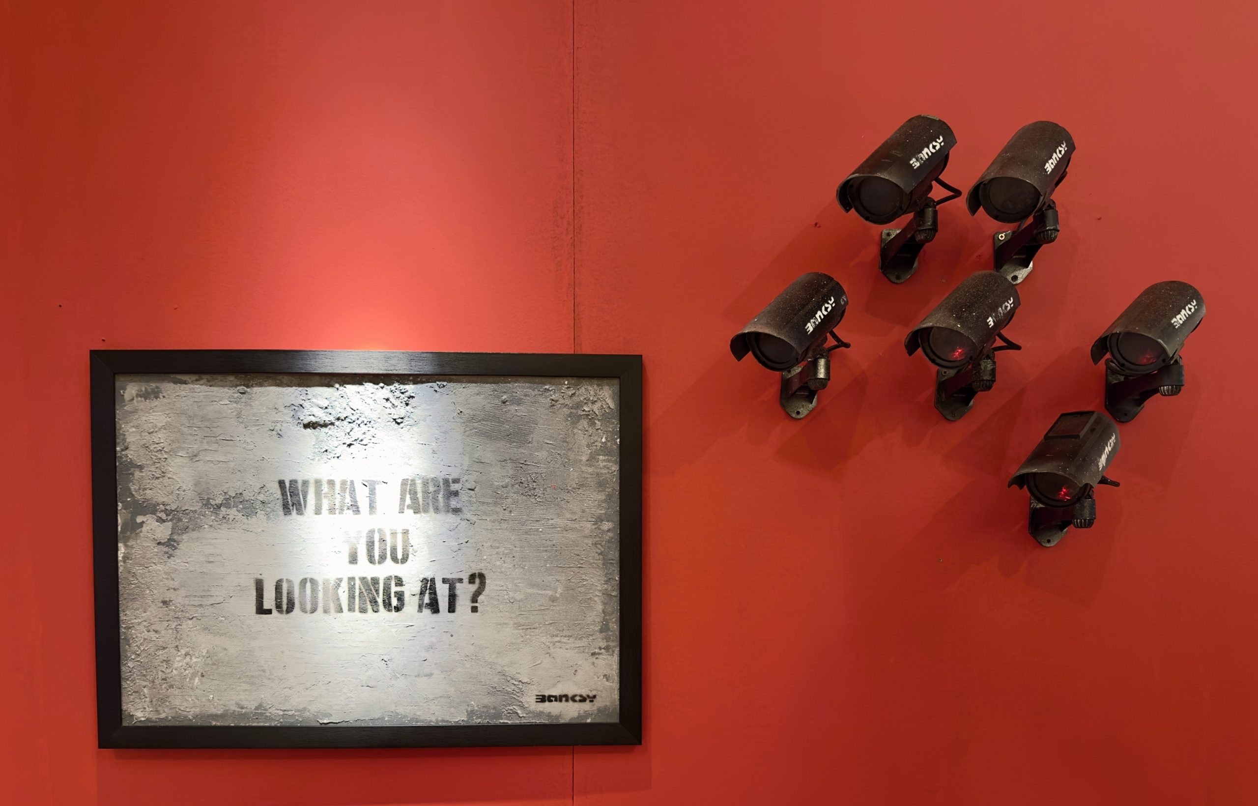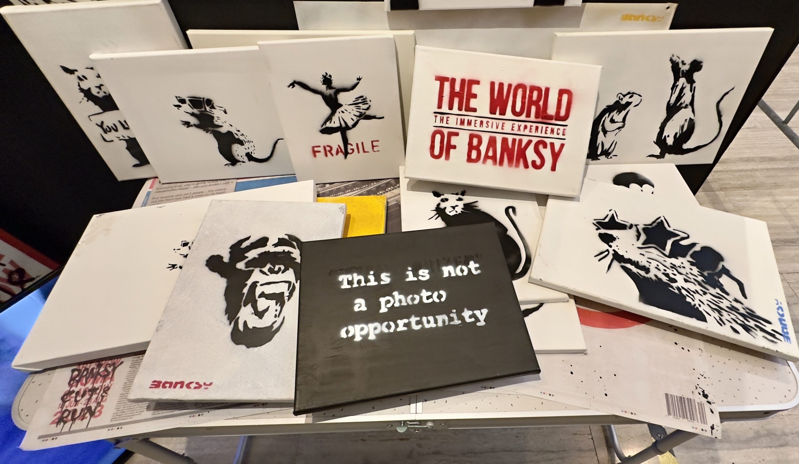 critico nei confronti della cultura, della politica e dell’establishment artistico, costringe il visitatore alla riflessione su argomenti spesso di attualità. Egli esprime, infatti, il suo spirito di ribellione all’ordine costituito, utilizzando i graffiti e le installazioni con materiali poveri, innovando i codici comunicativi della cultura di massa allo scopo di sensibilizzare l’opinione pubblica. A partire dagli anni ’90 realizza le sue opere su strade, ponti e mura grazie alla tecnica dello “stencil” (ovvero il ricavare su un supporto rigido una maschera in negativo dell’immagine che si vuole creare) che gli permette di agire con grande velocità eludendo l’attenzione dei passanti. Attivo principalmente a Bristol, sua città natale, nel giro di trent’anni ha realizzato i suoi graffiti negli spazi pubblici di tutto il mondo, Italia compresa, dove sono presenti a Napoli ed a Venezia.