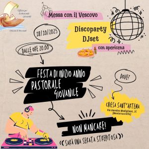 Seguirà un momento di festa (con apericena, discoparty, djset), per una serata di gioia, fede e comunità per dare il via al nuovo anno pastorale.