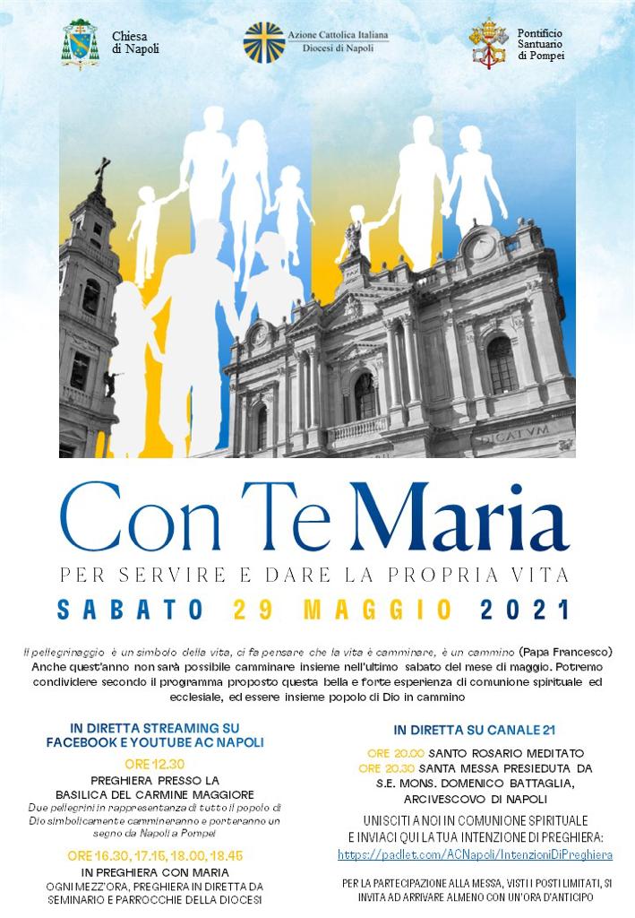 Il pellegrinaggio prosegue nel pomeriggio di sabato, “In preghiera con Maria”: a partire dalle ore 16.30 saranno proposti quattro momenti di preghiera e di meditazione in diretta sulle pagine Facebook e Youtube dell’Ac di Napoli, secondo gli orari sempre indicati in locandina (16.30 – 17.15 – 18.00 – 18.45). Ciascuno da casa potrà seguire e collegarsi all’orario che preferisce. I quattro momenti saranno animati dalle Associazioni parrocchiali e dagli amici del Seminario Arcivescovile di Napoli. La giornata si concluderà a Pompei, nel piazzale San Giovanni XXIII con la recita del Rosario meditato alle ore 20.00 e poi con la Celebrazione dell’Eucarestia alle ore 20.30 che sarà presieduta dall’arcivescovo di Napoli, don Mimmo Battaglia, in comunione con la Chiesa diocesana di Pompei. La celebrazione sarà trasmessa in diretta su Canale 21 e sulla pagina facebook Ac Napoli.