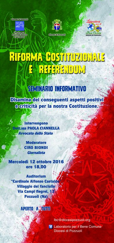 Mercoledì 12 ottobre, alle ore 18, nell’Auditorium “Cardinale Alfonso Castaldo” a Pozzuoli (Villaggio del Fanciullo – Via Campi Flegrei, 12), si svolgerà il seminario informativo sul tema: “Riforma costituzionale e referendum. Disamina dei conseguenti aspetti positivi e criticità per la nostra Costituzione”. Relatrice l’avvocato dello Stato, Paola Ciannella.