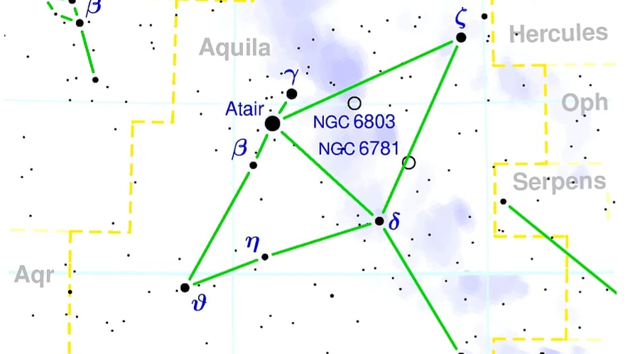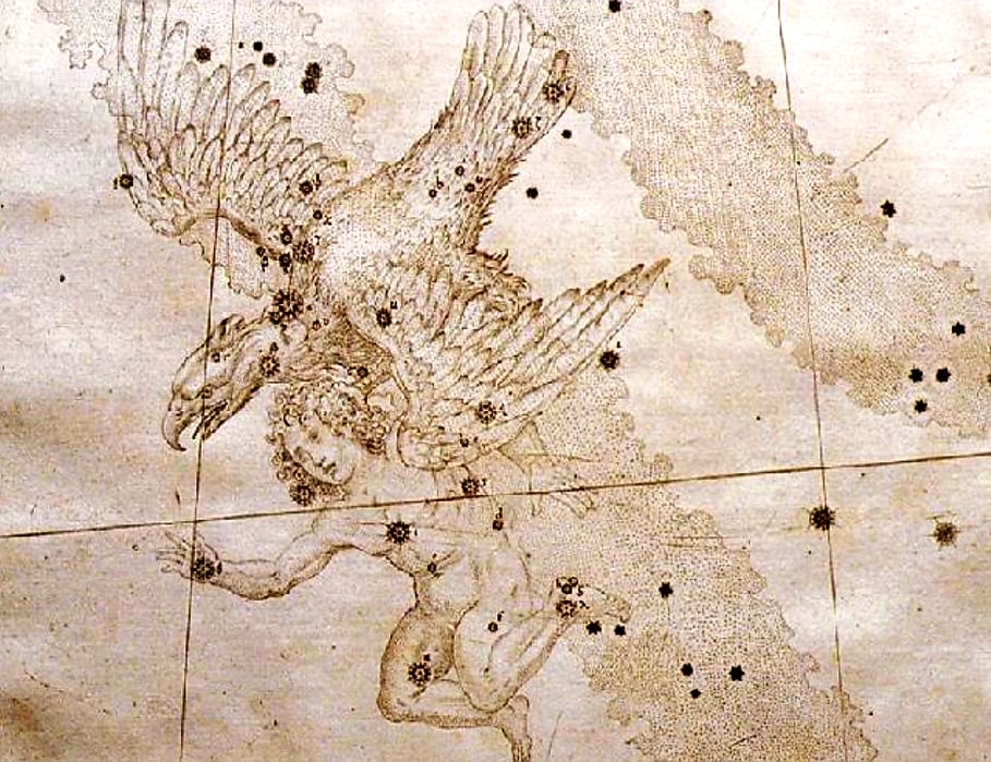 In genere la corrispondenza diventa maggiormente probabile se aumentano i monumenti che corrispondono alle stelle, ma per una valutazione affidabile ne occorrono una decina. Continuando a cercare altre corrispondenze in terraferma e anche con i resti in mare possiamo pensare che questi formano la Costellazione dell’Aquila (nelle foto il triangolo estivo all’interno della costellazione dell’Aquila e incisione raffigurante la costellazione – fonte web).