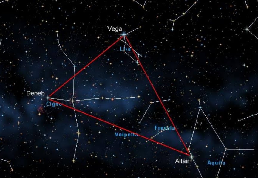 «Si chiama “triangolo estivo” perché le tre Stelle principali delle Costellazioni del Cigno della Lira e dell’Aquila sono disposte ai vertici di un triangolo ed “estivo ” perché questo gruppo domina il cielo dell’estate; le stelle sono Deneb, Altair e Vega (nella foto). Possiamo pensare a Puteoli (Pozzuoli) come città edificata secondo un disegno astronomico? Ipoteticamente sì; osservando la mappa della città si può notare come il Tempio di Serapide, l’Anfiteatro Flavio e il tempio di Augusto unite da linee rette formano un triangolo; sovrapponendo questi punti con le stelle sopra indicate si nota come gli stessi edifici sono in corrispondenza quasi precisa… ma questo non basta. È un significato simbolico. Tre stelle luminose accoppiate a tre simboli di potere. In età imperiale queste cose le facevano… La mappatura del cielo sulla Terra è un problema mal posto. Sappiamo che talune costellazioni furono mappate disponendo opportunamente i monumenti, se per chi li dispose fu un lavoro facile, per noi riconoscere le costellazioni dimostrando che è veramente così diventa un lavoro molto difficile.