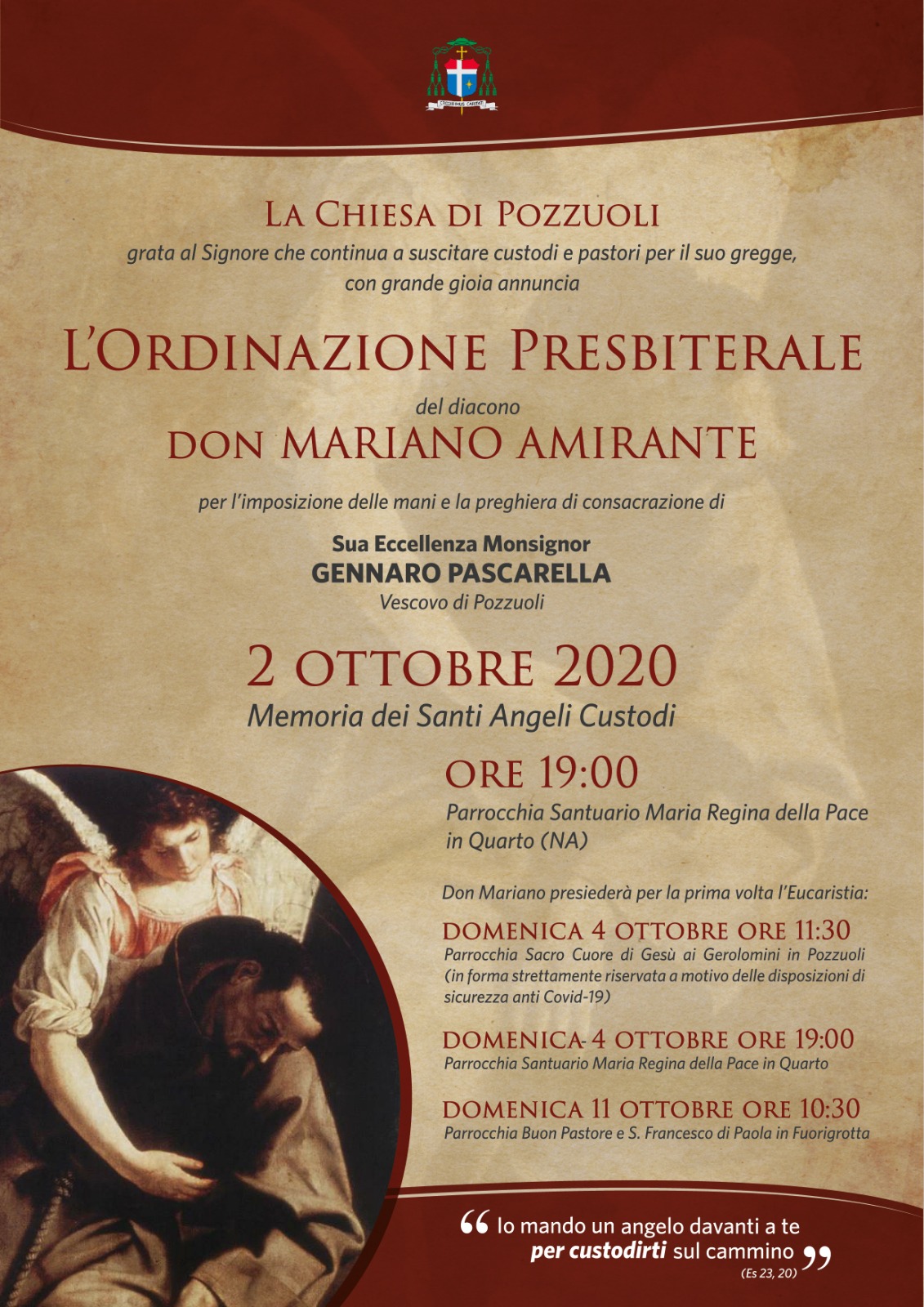 Venerdì 2 ottobre, nel giorno dedicato alla Memoria dei Santi Angeli Custodi, alle ore 19, nella parrocchia santuario Maria Regina della Pace a Quarto (Via Plinio il Vecchio, 12), il diacono Mariano Amirante sarà ordinato presbitero dal vescovo, monsignor Gennaro Pascarella.
