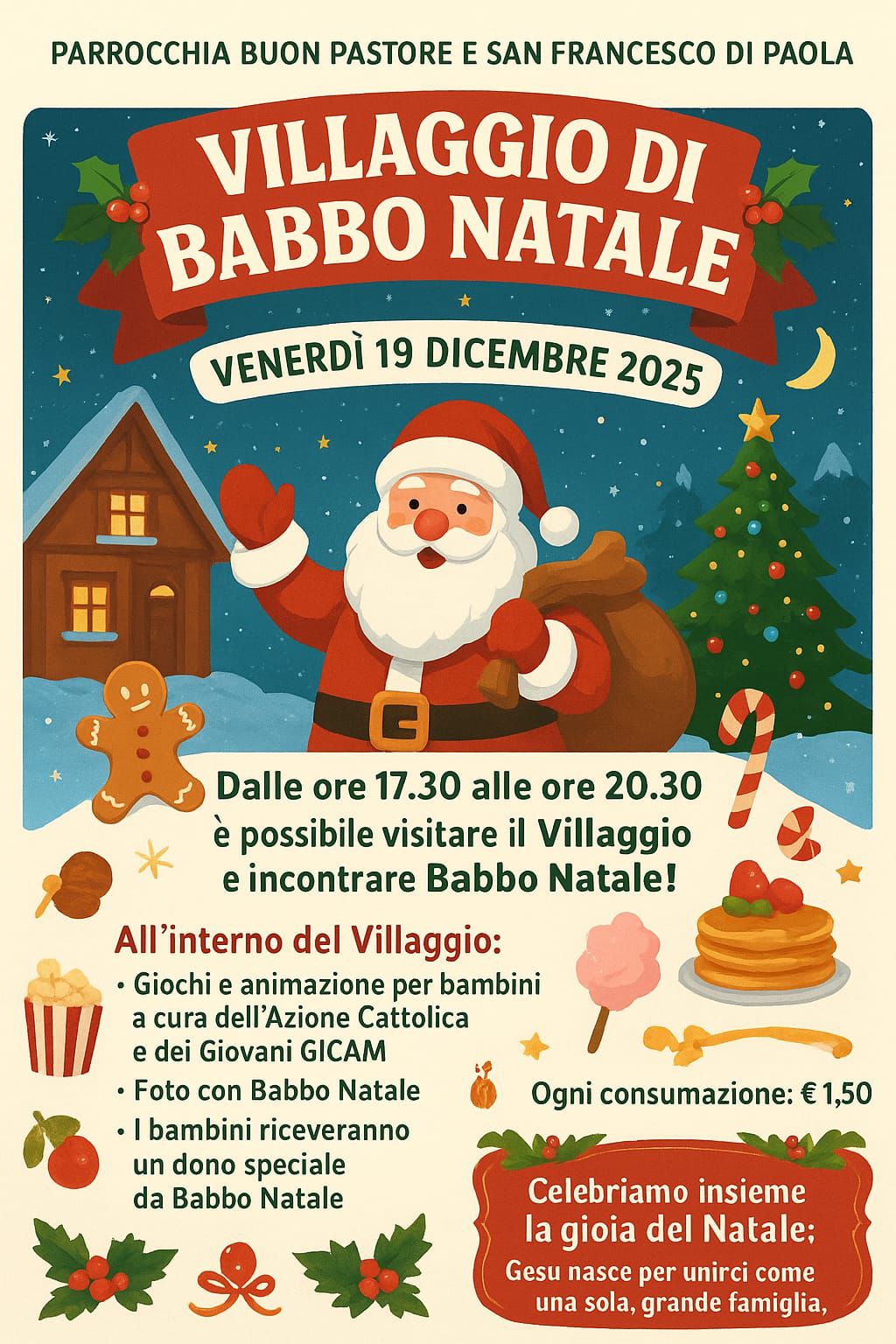 Venerdì 19 dicembre, dalle ore 17.30 alle 20.30, la comunità parrocchiale Buon Pastore e San Francesco di Paola a Napoli (via delle Legioni, 10 – Fuorigrotta), guidata dal parroco don Giovanni Napolitano, organizza il Villaggio di Babbo Natale.