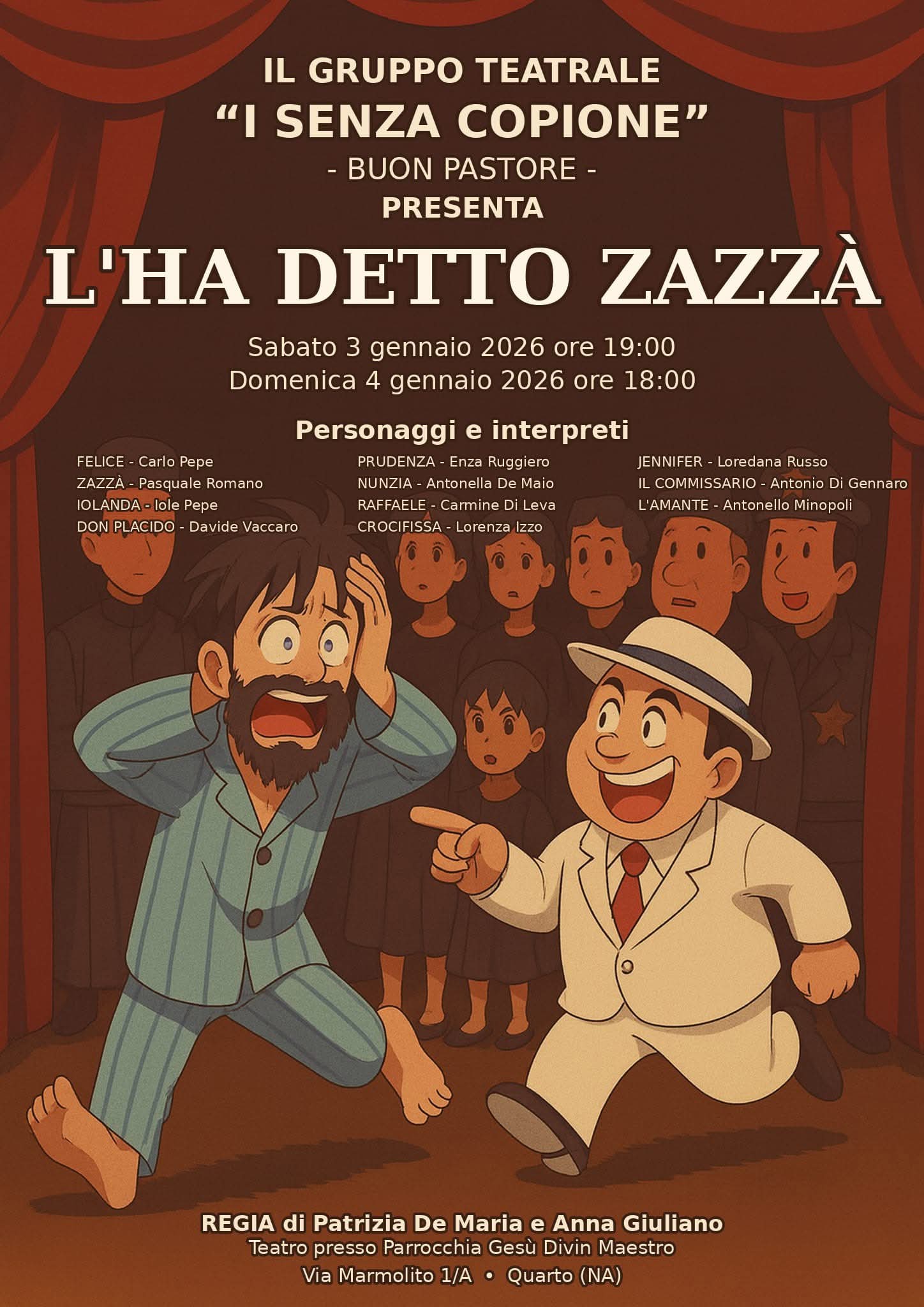 Nella parrocchia è stato avviato il Gruppo teatrale “I senza copione”, che presenterà lo spettacolo “L’ha detto Zazzà”, sabato 3 (ore 19) e domenica 4 gennaio (ore 18), nel teatro della chiesa Gesù Divino Maestro a Quarto (via Marmolito, 1/A), regia di Patrizia De Maria e Anna Giuliano.